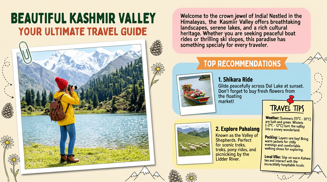 Example prompt:Create image of Magazine feature article [travel] guide page, cute, information dense photo book style magazine feature article page. Add all necessary sections, tips, recommendations, information. add photos for any sections and recommendations if you like. Place the attached person at the precise location of [BEAUTIFUL IN THE KASHMIR VALLEY]. Seamlessly blend the attached person as if they are sightseeing. Approach this task with the understanding that this is a critical, information rich page that will significantly influence visitor numbers, text accuracy is important. Fully use the entire [16:9] page.