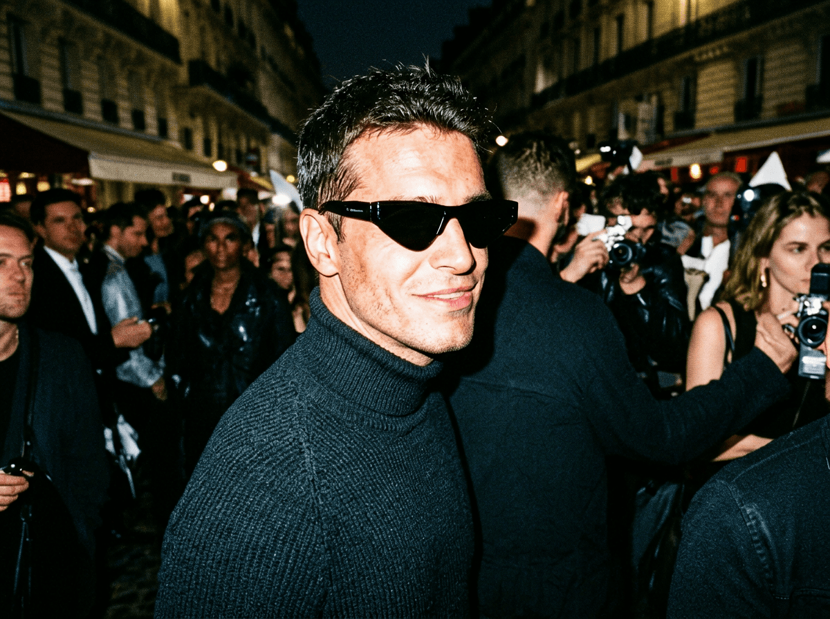 Example prompt:Unplanned paparazzi style portrait, an intense, close-up moment capturing a man with striking features as he [looks over his shoulder with a confident smirk]. Shot from a slightly low angle, showing only his face and shoulders amidst a blurred, bustling crowd. The image feels raw and spontaneous, lit by a harsh flash, high-ISO texture. He's wearing [a dark turtleneck and stylish sunglasses], embodying effortless street style chic, the energy and atmosphere reminiscent of Paris Fashion Week chaos.