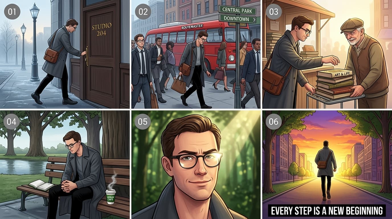 Example prompt:This is a 16:9 multi-panel narrative illustration composed in a 3×2 grid layout (three panels per row, two rows total), centered around the theme of a “character journey,” depicting the daily emotional and psychological progression of an urban man. The art style is detailed and refined, with color tones gradually shifting from slightly cool to warm as the story unfolds. Each panel features a small gray circular icon in the top-left corner, containing white numbers from “01” to “06.” [Panel 01]: A side-view shot in the early morning. The protagonist is a man in his early thirties, wearing round glasses, a long dark gray coat, and slim black trousers. He carries a brown leather crossbody bag and is pushing open a dark wooden door labeled “STUDIO 204” in gold lettering as he steps onto the street. Old-fashioned street lamps are still lit in the background, and the ground shows faint traces of morning dew, creating a calm and quiet atmosphere. [Panel 02]: A busy urban mid-shot. The protagonist walks along a crowded sidewalk surrounded by hurried office workers. A red vintage bus marked “ROUTEMASTER” passes by him. Nearby street signs point toward “CENTRAL PARK” and “DOWNTOWN.” He appears slightly fatigued, lowering his gaze as he navigates through oncoming pedestrians carrying briefcases. [Panel 03]: A warm, intimate interaction close-up. The protagonist stops at a street corner stall and reaches out to help an elderly man steady a teetering stack of old books on a small cart. The title of the top book is clearly visible: “ART & LIFE.” The old man, wearing a newsboy cap, smiles kindly in gratitude. The lighting becomes brighter here, with soft side light gently outlining the figures. [Panel 04]: A quiet moment in the park. The protagonist sits alone on one end of a bench beneath a row of tall oak trees. On the seat beside him lies an open notebook and a steaming cup of coffee labeled “URBAN CAFE.” Leaning forward with his hands clasped on his knees, he gazes thoughtfully at the calm lake ahead, immersed in deep reflection. [Panel 05]: A close-up of the protagonist’s face. The camera captures a subtle shift in his expression. His previously furrowed brows relax, and a slight smile forms on his lips, conveying a sense of release and determination. Sunlight enters from above at an angle, leaving a bright reflection on his glasses, while the background fades into a soft blur of green foliage and dappled light. [Panel 06]: A powerful wide shot from behind. The protagonist strides forward with purpose and confidence along a straight, tree-lined avenue toward a glowing golden horizon. Buildings on both sides converge at the vanishing point. The sky is painted with a dramatic orange-purple sunset. At the bottom center of the frame, bold black text reads: “EVERY STEP IS A NEW BEGINNING.”