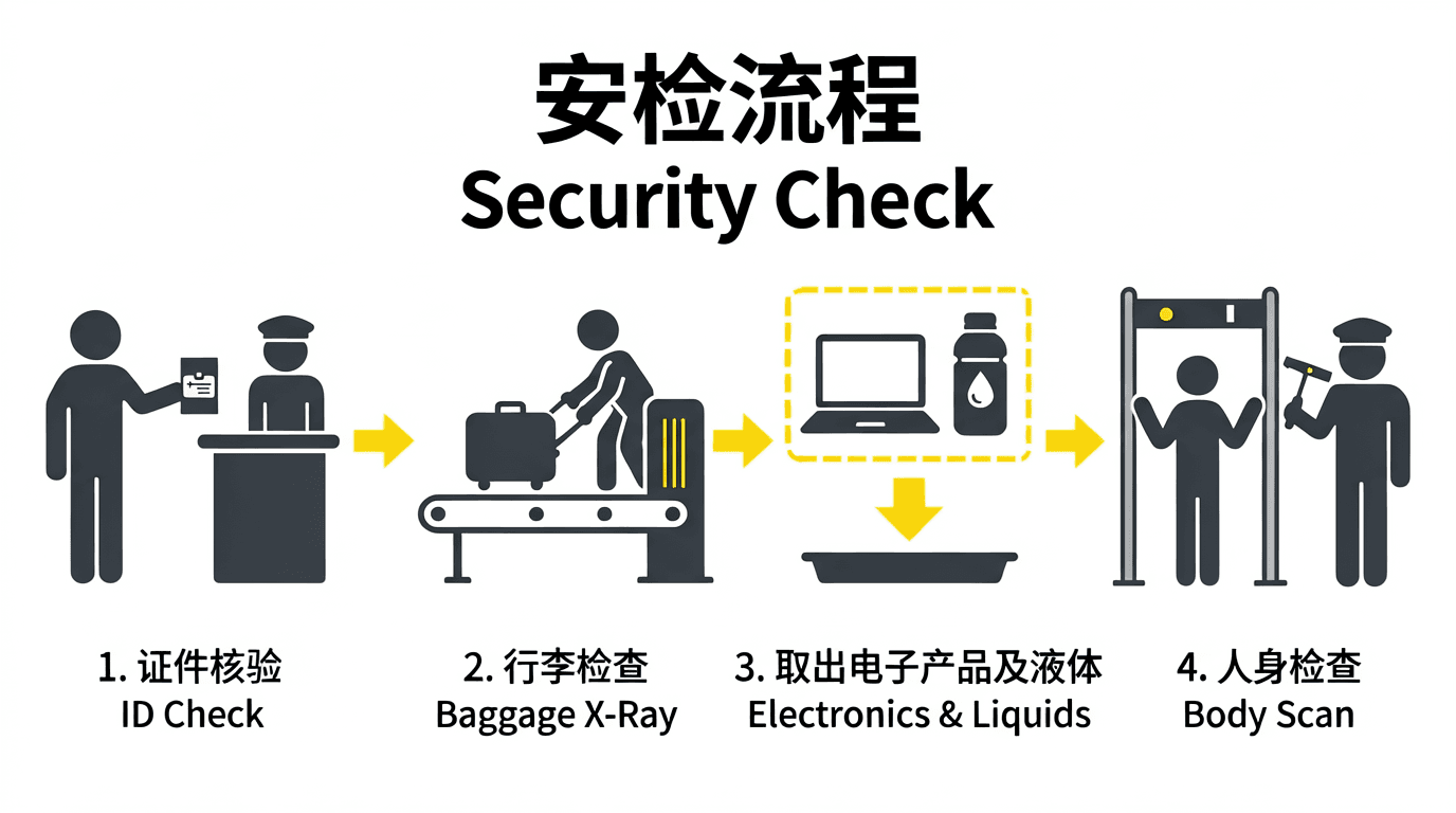 Example prompt:A flat, minimalist-style pictogram instructional diagram. The layout is horizontal with a pure white background, devoid of any extraneous background decoration. The overall design is highly symbolic, using dark gray as the primary graphic color with bright yellow as an accent and emphasis color. The image has absolutely no perspective effect; all figures and objects are composed of pure geometric shapes (such as perfectly circular heads and equal-width thick lines forming limbs and torsos), and the figures have no facial expression features whatsoever. At the top center of the image are two lines of clear, bold black text: the upper line reads in Chinese '安检流程,' and the lower line reads in slightly smaller English 'Security Check.' Below the text, four pictographic icons are arranged horizontally from left to right to form a complete set of operational step instructions. Each step is connected by a solid yellow rightward-pointing arrow, guiding the visual sequence. On the far left is the first step: a dark gray pictographic figure stands upright, extending the right arm to hand a small square booklet bearing an ID document symbol to another pictographic security officer wearing a peaked cap, positioned behind a counter to the left. Beneath this scene are two lines of centered text: '1. 证件核验' and 'ID Check.' The second step to the right depicts a horizontal conveyor belt and a square X-ray security scanner with yellow scanning lines inside. A pictographic figure is slightly bending forward, placing a rectangular suitcase with a pull handle and rolling wheels onto the conveyor belt with both hands. Below it reads: '2. 行李检查' and 'Baggage X-Ray.' In the third step, the main elements are an open laptop icon and a cylindrical water bottle icon bearing a liquid droplet symbol. These two items are enclosed within a yellow dashed-line box, beneath which a downward arrow points to a rectangular tray, indicating that the items should be placed into the tray. Below it reads: '3. 取出电子产品及液体' and 'Electronics & Liquids.' On the far right is the fourth step: a pictographic figure stands in the center of an inverted U-shaped metal detector gate with both arms raised out to the sides of the body. To the right of the detector gate stands a security officer holding a short, baton-shaped handheld scanning wand aimed at the figure. Below it reads: '4. 人身检查' and 'Body Scan.' The overall page layout is neat and orderly, the icons are visually proportionate and consistent, the information hierarchy is clearly defined, and the design strictly adheres to internationally standardized public information signage conventions.